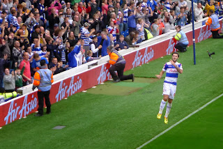 The ravaj could get used to these winning ways. Today QPR players were kind enough to save the goalscoring until the second half when they were facing the Loft (where the home supporters sit). And Charlie Austin, despite my feeble taunts of "he scores one in ten shots" (well I just didn't agree with the Loft chant of "he scores when he wants" because he patently does not), celebrated his two goals (including another penalty kick) just about in front of us: